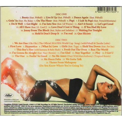 CD 1: 01. On The Floor (Featuring Pitbull) 02. Papi 03. Do It Well 04. Get Right (Featuring Fabolous) 05. I'm Into You (Featuring Lil Wayne) 06. Ain't It Funny 07. Let's Get Loud 08. All I Have (Featuring LL Cool J) 09. Love Don't Cost A Thing 10. If You Had My Love 11. Jenny From The Block (Featuring Jadakiss, Styles) 12. Waiting For Tonight 13. (What Is) Love? 14. Fresh Out The Oven 15. Hold It Don't Drop It 16. I'm Real 17. I'm Glad 18. Hold You Down (Featuring Fat Joe) 19. I'm Gonna Be Alright 20. Que Hiciste CD 2: 01. Hypnotico 02. Invading My Mind 03. Run The World 04. This Boy's Fire (Featuring Santana) 05. Stay Together 06. Play 07. I Got U 08. The One 09. Feelin' So Good 10. Baby I Love U 11. No Me Ames (Featuring Marc Anthony) 12. Me Haces Falta 13. Need Love 14. Cherry Pie 15. We Gotta Talk 16. It's Not That Serious 17. Dame (Touch Me) 18. Still Around 19. Carino 20. Theme From Mahagony (Do You Know Where You're Going To)